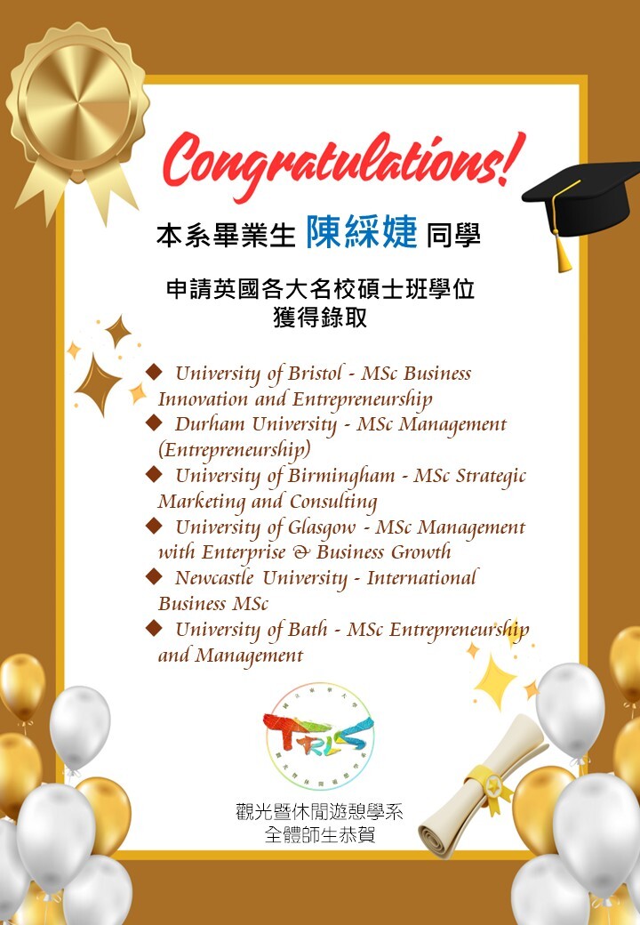 本系學士班畢業生陳綵婕同學,申請並獲得英國各大名校碩士學位(graduate program)錄取,幾乎都是世界排名100內的頂尖名校,是系上的榮耀,學弟妹的榜樣!